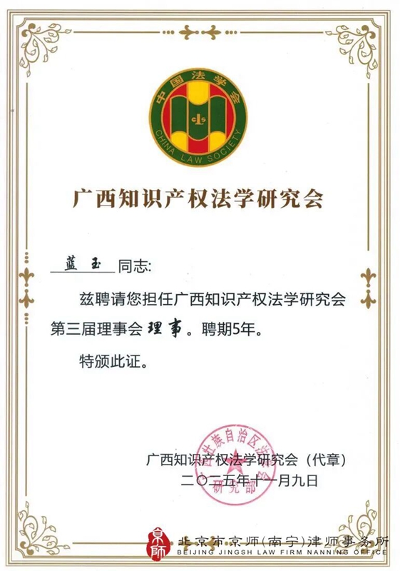京师南宁律所知识产权法律事务部主任、执业律师、执业专利代理师蓝玉当选广西知识产权法学研究会第三届理事会理事,聘期5年。