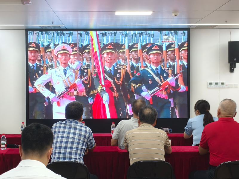 上午9时许,全体人员有序到场就坐,大家精神状态十分饱满,会议室的大屏幕同步转播天安门阅兵式的直播画面,大家专注凝视屏幕,认真聆听习近平总书记发表重要讲话。9:40分,威武的受阅方阵迈着整齐划一、铿锵有力的步伐通过检阅台,先进的国防装备依次亮相,充分彰显大国雄厚的军事实力,现场不由自主地响起由衷的赞叹之声。