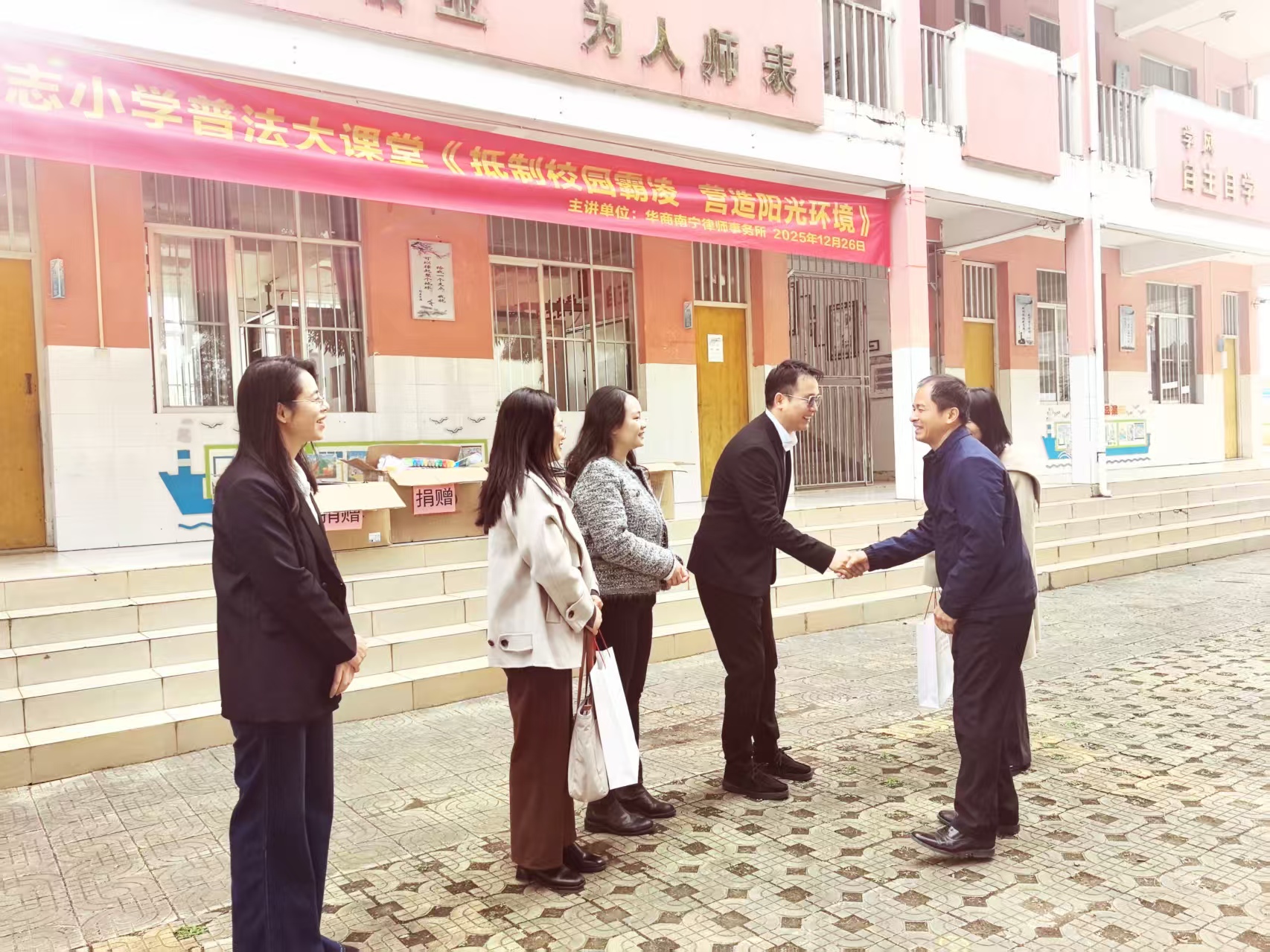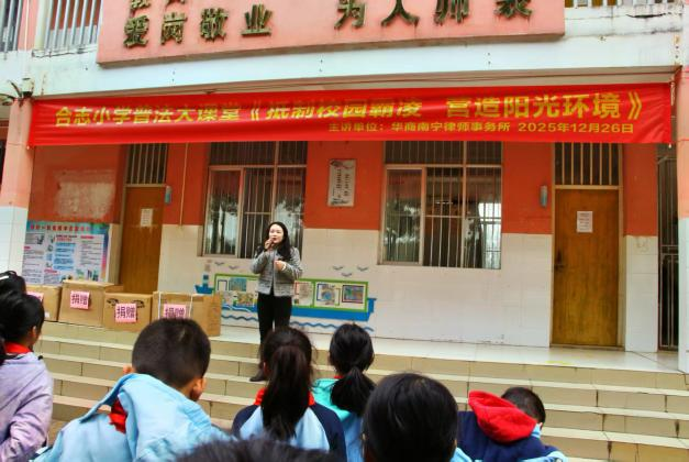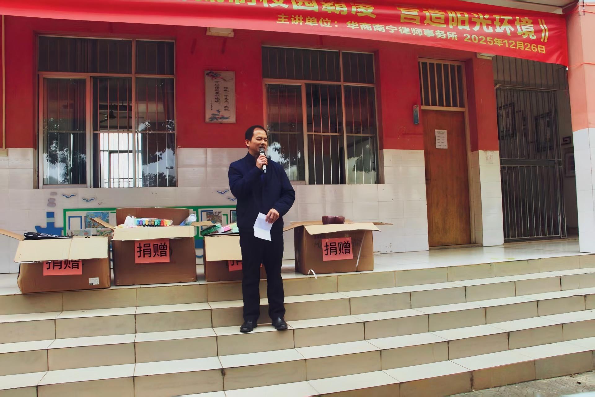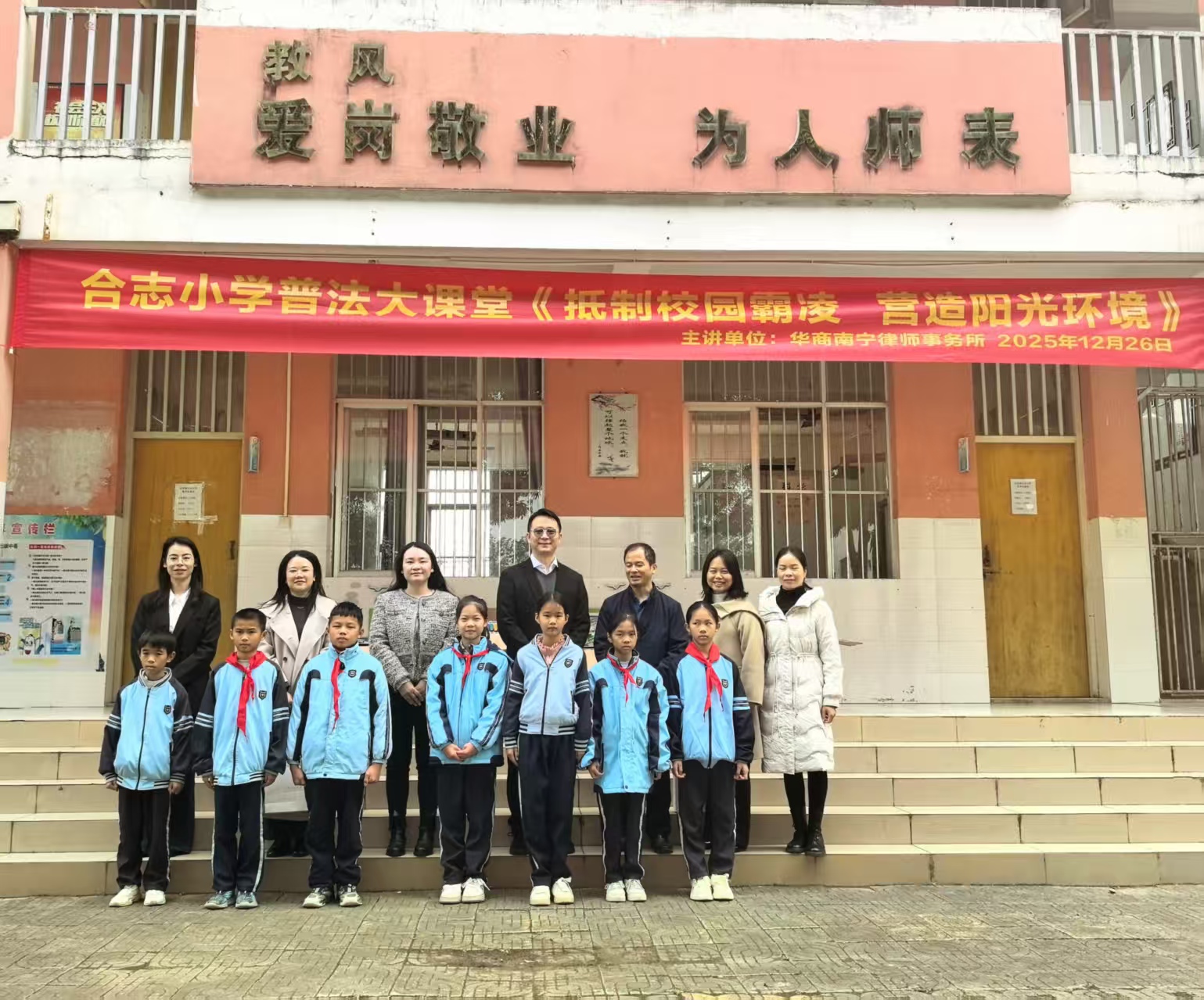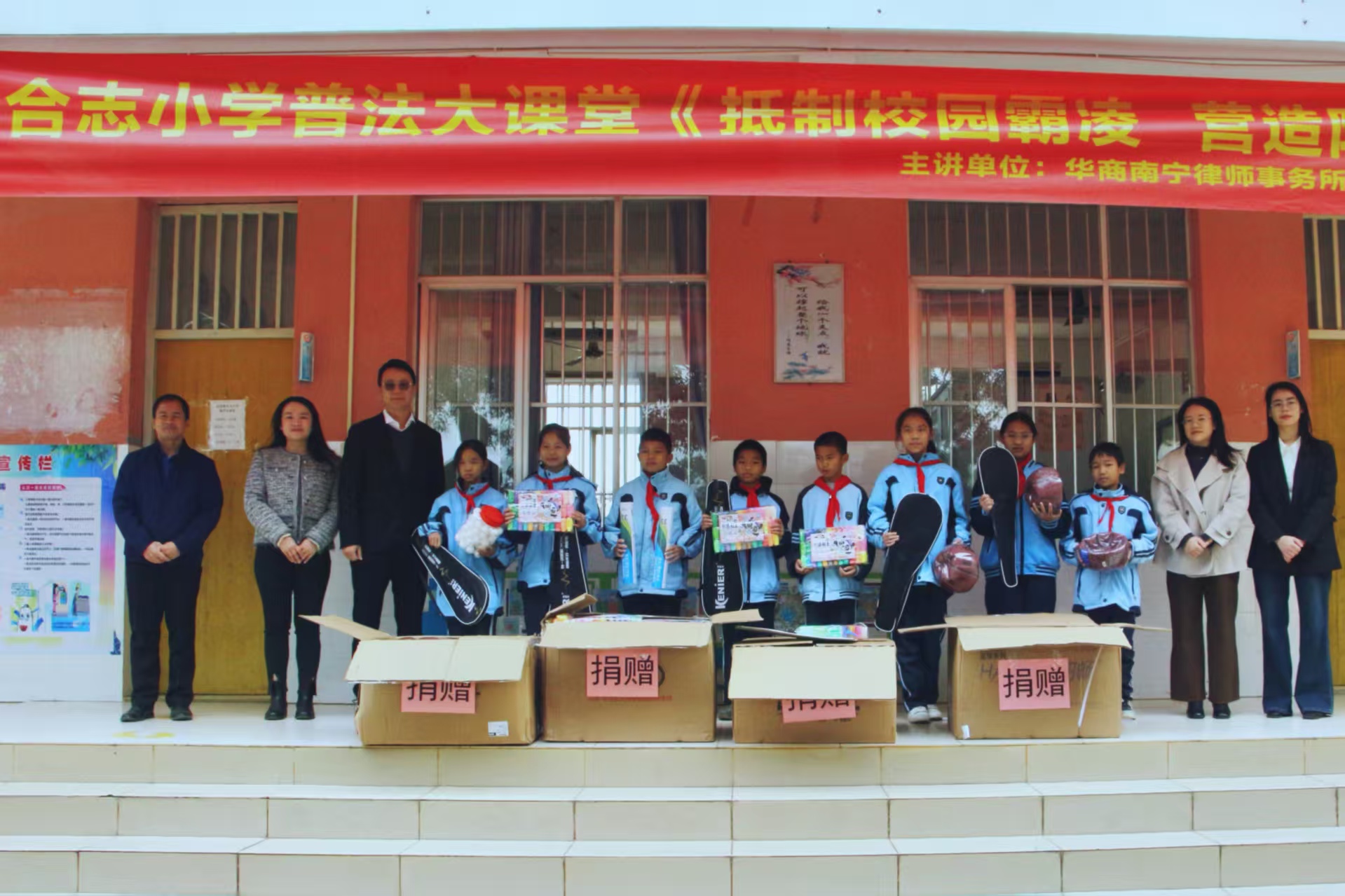 为增强小学生的法治观念与自我保护意识,营造安全、友善、健康的校园环境,2025年12月26日,中共广东华商(南宁)律师事务所支部走进南宁市西乡塘区坛洛镇合志小学,成功举办了“抵制校园霸凌,营造阳光环境”校园普法宣传暨体育用品捐赠活动。本次活动由律所执行与破产重整中心主任、华商合规研究院南宁分院主任官羽翔律师党员,青工委主任、公益委副主任邓雅文律师党员,家族信托与婚姻家事委主任、公司委副主任陈福有律师、青工委副主任周洛妤律师党员、财税委秘书江宇玉律师党员等共同参与,合志小学校长周荣葵带领全体师生参加了此次活动。