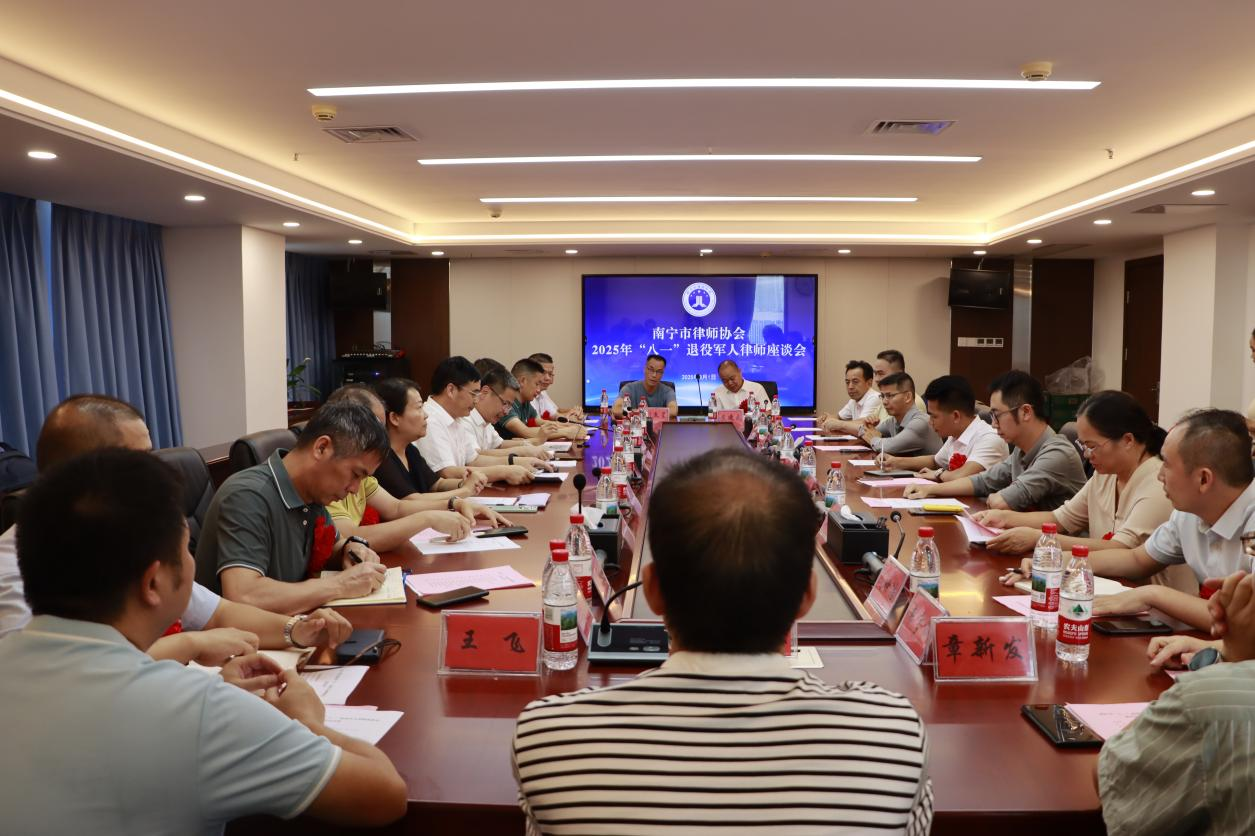 2025年8月1日,南宁市律师协会2025年“八一”退役军人律师座谈会在南宁市律师协会会议室召开。南宁市律师协会会长周海船应邀出席,南宁市律师协会财务委员会副主任黄学明、南宁市退役军人律师代表等23人参加座谈。座谈会由南宁市律师协会副会长蓝斌主持。