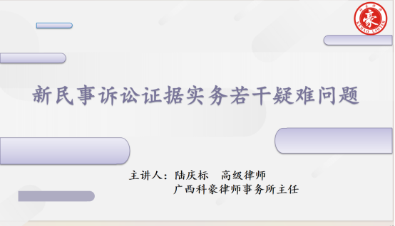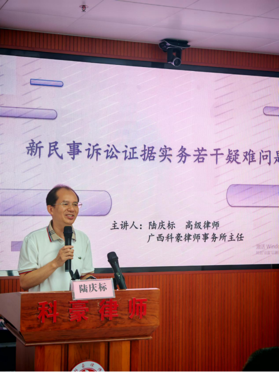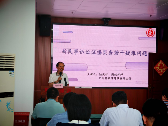 为进一步提升律师职业技能,强化实务能力,南宁市律师协会于2024年6月23日在南宁市律师继续教育培训基地广西科豪律师事务所成功举办《新民事诉讼证据实务若干疑难问题》专题培训,本次培训主讲人是广西科豪律师事务所主任、高级律师陆庆标,现为广西科技大学兼职教授、中共南宁市律师行业党委委员、南宁市律师协会副会长。