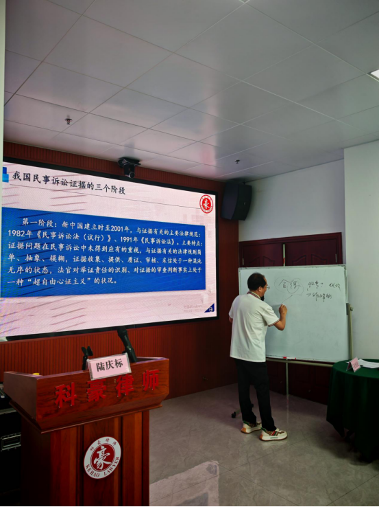 陆庆标高级律师根据最高人民法院2020年5月1日施行的《最高人民法院关于民事诉讼证据的若干规定》,从民事诉讼证据发展历程、如何理解“以事实为根据 以法律为准绳”、预判民事官司输赢三步法、当事人举证、举证责任的例外之一-自认、当事人申请鉴定、举证时限和证据交换、质证八个方面,结合科豪律师团队的办案经验,向参与培训的人员分享了处理案件的思维,提出疑难问题,与参与培训的人员共同探讨,内容丰富,重点突出,深入浅出,具有很强的实务指导性。陆庆标律师丰富的实务经验、生动的实务讲解,善于调动参训人员的情绪,让参与培训的律师们情绪高昂,现场气氛高涨,课堂气氛活跃,大家积极互动,足足三个小时的培训,效果很好。