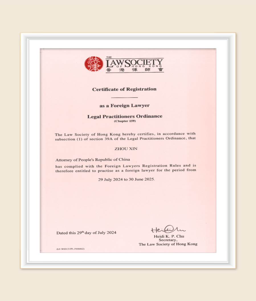 2024年7月,广西格局律师事务所(Gorgeous Partners)创始人、首席合伙人、主任周鑫律师经香港律师会(The Law Society of Hong Kong)审核批准,获得“香港注册外地律师”(Registration as a Foreign Lawyer Leagal Practitioners Ordinance)资格,担任香港律师事务所注册外地律师,提供中国内地法下的法律服务。
