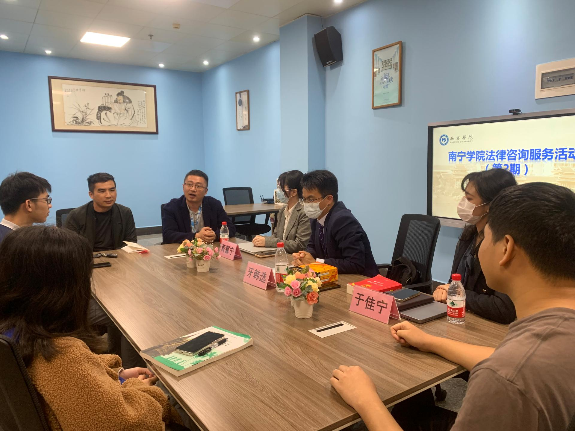 上海市汇业(南宁)律师事务所驻南宁学院大学生法律咨询服务站自成立以来,积极为在校师生开展普法宣传及法律援助活动。为进一步加强校园法制宣传教育,丰富师生法律知识,创建和谐校园、平安校园。2022年4月21日晚,汇业(南宁)律师事务所牙韩选律师、于佳宁、黄馨宁一行到南宁学院开展第二期普法沙龙活动,为学生进行法律问题解答。南宁学院学工处刘波副处长、思政科负责人文有森及十多名学生代表参加本次活动。