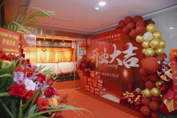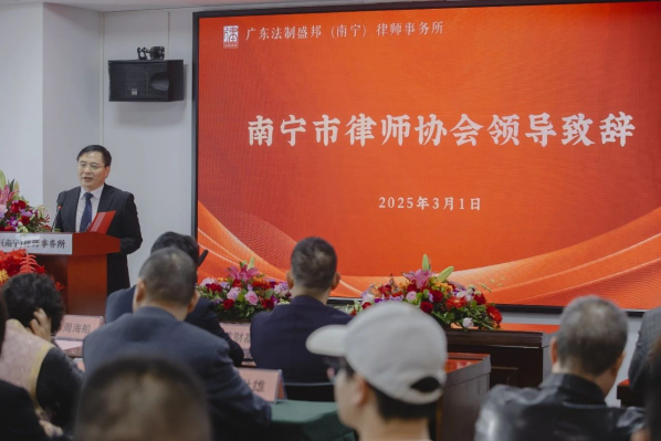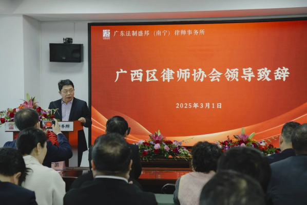 2025年3月1日(乙巳蛇年二月初二,龙抬头吉日),广东法制盛邦(南宁)律师事务所开业庆典在南宁隆重举行。典礼由南宁分所副主任王心卓主持,广西壮族自治区律师协会副会长黄财基、南宁市律师协会会长周海船、民建南宁市委员会专职副主委杨屹、广西桂海天律师事务所终身荣誉主任许邕桂、广西警察学院法学院院长廖原、广西河南商会会长刘泉峰、广西典当协会秘书长刘毅、南宁市经济技术开发区商会会长王世雄、广东法制盛邦律师事务所主任、党委副书记陈广鹏、监事会主席傅显扬律师、管委会成员唐勇律师、吴石明律师、秦建龙律师以及来自南宁、广西、香港、全国各地多所律所主任(代表)、高校老师、好友共90多人共同出席。