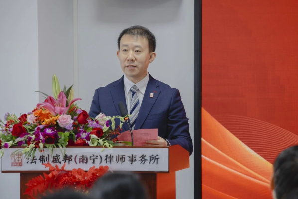 周海船会长在开业典礼上对法制盛邦(南宁)分所成立致以诚挚祝贺,并期望南宁分所凭专业、经验、敬业赢得认可,紧握机遇,为法治南宁建设贡献力量。