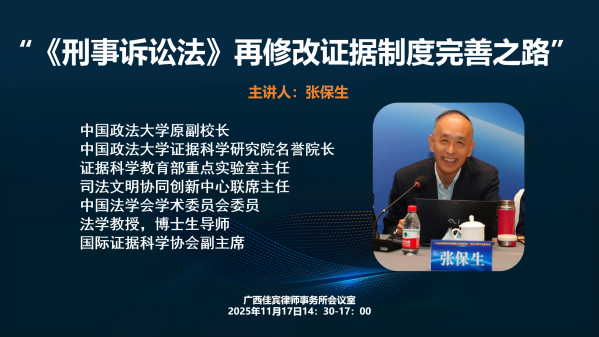 2025年11月17日下午,广西佳宾律师事务所作为南宁市律师继续教育培训基地举办了“《刑事诉讼法》再修改证据制度完善之路”主题讲座。佳宾所特别邀请了中国政法大学原副校长、证据科学研究院名誉院长、证据科学教育部重点实验室主任、司法文明协同创新中心联席主任、中国法学会学术委员会委员、国际证据科学协会副主席、博士生导师张保生教授作为此次讲座的主讲人。近80名律师到场听课,现场座无虚席。讲座由本所副主任宁苑棋律师主持。
