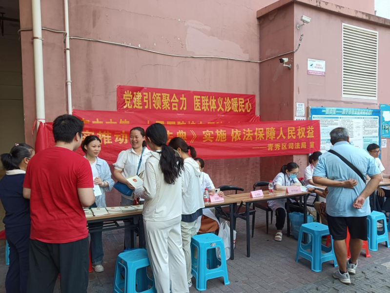 为进一步深化法治宣传实效,切实推动《中华人民共和国民法典》走进千家万户,融入居民日常生活,6月6日,南宁市青秀区司法局津头司法所联合大板三社区,在星湖路南一里开展民法典宣传活动,将法治“盛宴”直接送到居民家门口,南宁市新入职到司法所实践锻炼的青年律师也来到了现场,向当地居民普及法律知识,助力民法典真正“飞入寻常百姓家”。
