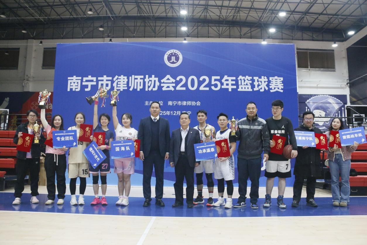 12月27日,篮球赛闭幕式在昊润球馆盛大举行,为这场热血沸腾的赛事画上圆满句号。南宁市律师协会副会长滕黄铁、王秀良亲临现场,为在比赛中表现卓越的队伍颁奖。