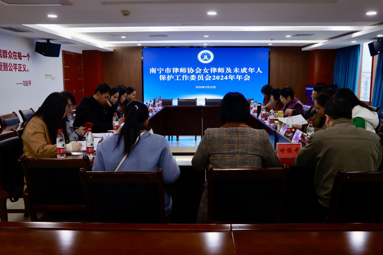 2025年2月23日,南宁市律师协会女律师及未成年人保护工作委员会召开2024年年会,南宁市律师协会副会长韦琳、副监事长王小兵及女律师及未成年人保护工作委员会全体委员参加会议。会议由女律师及未成年人保护工作委员会主任谢冬梅主持。