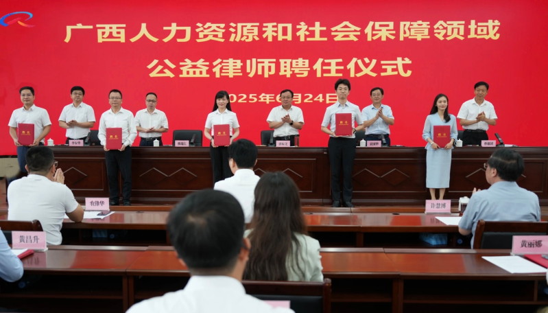 为助力提升广西法治水平,有效预防和化解行政诉讼、行政复议相关问题,更好地服务民生,广西人力资源和社会保障厅决定组建人力资源社会保障领域公益法律服务团,并于2025年6月24日下午在南宁举办广西人力资源和社会保障领域公益律师聘任仪式。自治区相关部门领导、广西律师协会代表及公益法律团成员等参加仪式,仪式由自治区人力资源社会保障厅党组副书记、副厅长袁国华主持。