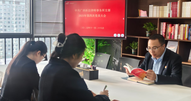 2025年11月28日下午,中共广西析法律师事务所支部组织召开2025年第四次党员大会,通过专题学习、视频观摩与主题党日活动相结合的形式,推动党员教育走深走实,进一步强化党员队伍的思想政治建设与党性修养。会议由潘冠霖书记主持,全体党员参加。