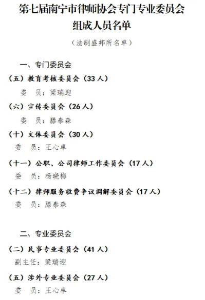 近日,第七届南宁市律师协会专门、专业委员会组成人员名单正式印发,我所梁瑞迎、王心卓、杨晓梅、滕泰森律师凭借专业素养与执业能力成功入选!