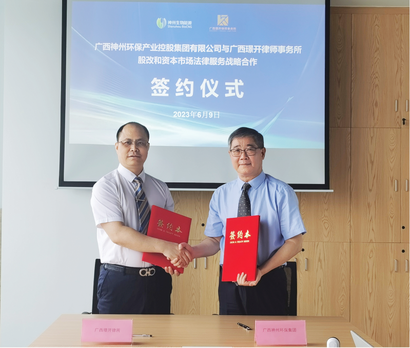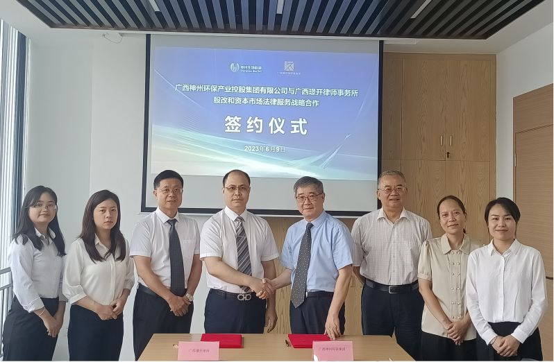2023年6月9日,广西璟开律师事务所(简称“璟开律所”)与广西神州环保产业控股集团有限公司(简称“神州集团”)在神州集团会议室举行了股改和资本市场法律服务战略合作文件签字仪式,神州集团董事长罗浩夫先生、璟开律所主任廖国靖先生,以及公司相关领导、律所部分项目组成员出席了本次签约仪式。