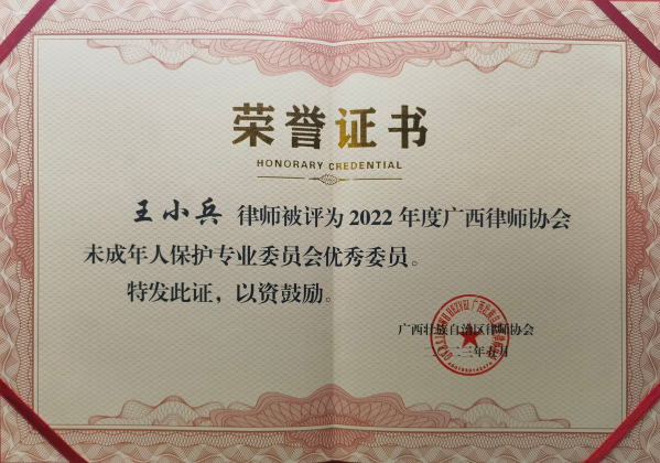 广西佳宾律师事务所主任王小兵律师在此次评选活动中被评选为2022年度广西律师协会未成年人保护专业委员会优秀委员。