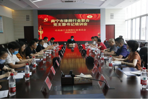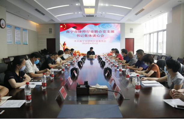 2020年6月4日上午,南宁市律师行业联合党支部书记集体谈心暨培训会在南宁市司法局213会议室召开。市律师行业党委委员和市律师协会秘书长黄家荣出席会议,会议由南宁市律师行业党委副书记、市司法局律师工作科科长陆峰主持。