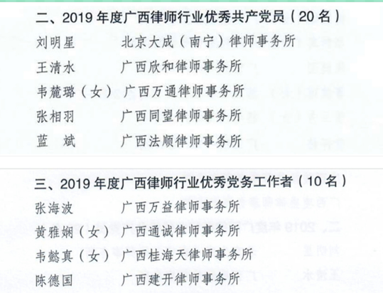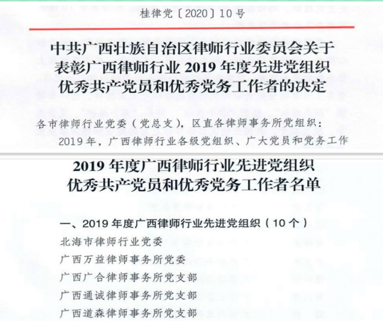 近日,中共广西道森律师事务所支部委员会荣获2019年度广西律师行业“先进党组织”的称号、中共广西法顺律师事务所支部书记蓝斌同志荣获2019年度广西律师行业“优秀共产党员”的称号、中共广西建开律师事务所支部委员会书记陈德国同志荣获2019年度广西律师行业“优秀党务工作者”的称号。