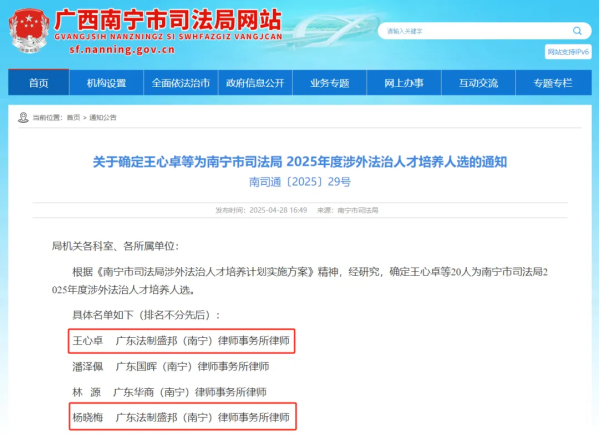 近日,广西南宁市司法局发布《关于确定王心卓等为南宁市司法局2025年度涉外法治人才培养人选的通知》。广东法制盛邦(南宁)律师事务所王心卓、杨晓梅律师入选南宁市司法局涉外法治人才培养计划。