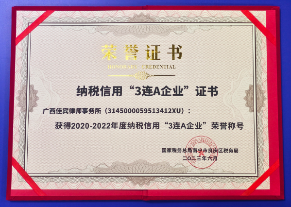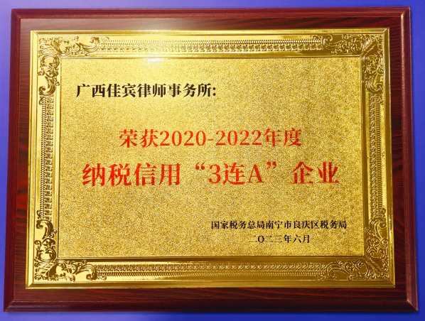 2023年6月,广西佳宾律师事务所荣获国家税务总局南宁市良庆区税务局颁发的2020-2022年度纳税信用“3连A企业”称号,并于2023年9月12日收到荣誉牌匾及证书。佳宾所自成立以来就一直坚持依法合规经营,积极依法纳税,履行社会责任。此次纳税信用“3连A企业”荣誉称号是国家税务总局南宁市良庆区税务局对佳宾所长期以来诚信经营、依法纳税的高度肯定和认可,充分展现了佳宾所良好的企业形象。佳宾所会一如既往地坚持依法合规经营、诚信纳税,自觉维护好企业形象,为地方经济发展贡献力量。