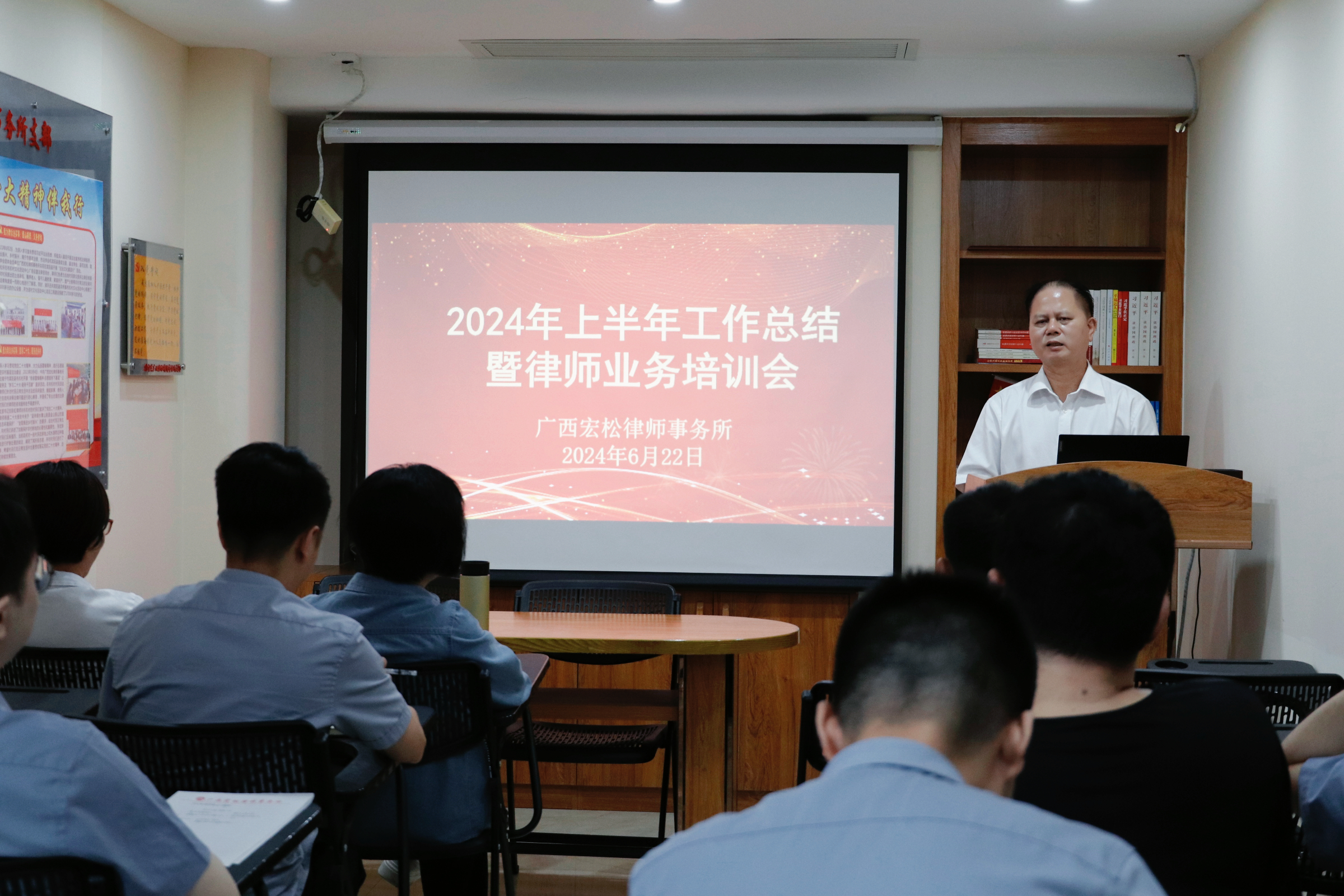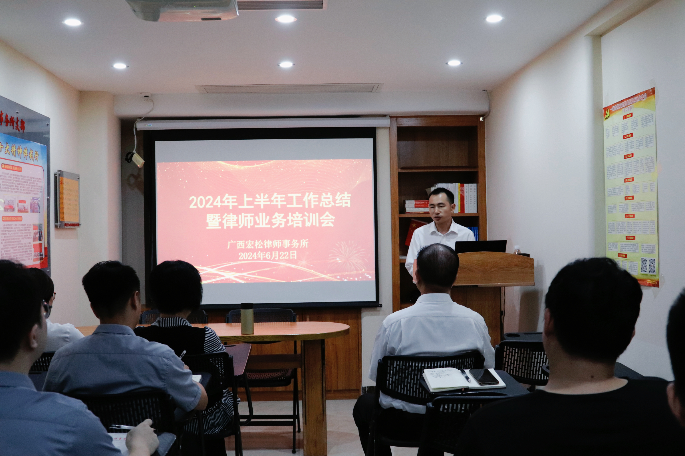 2024年6月22日下午,广西宏松律师事务所召开2024年上半年工作总结暨第六期律师业务培训会。本所全体律师、实习律师及行政人员参加了会议。会议由蒋政律师主持。